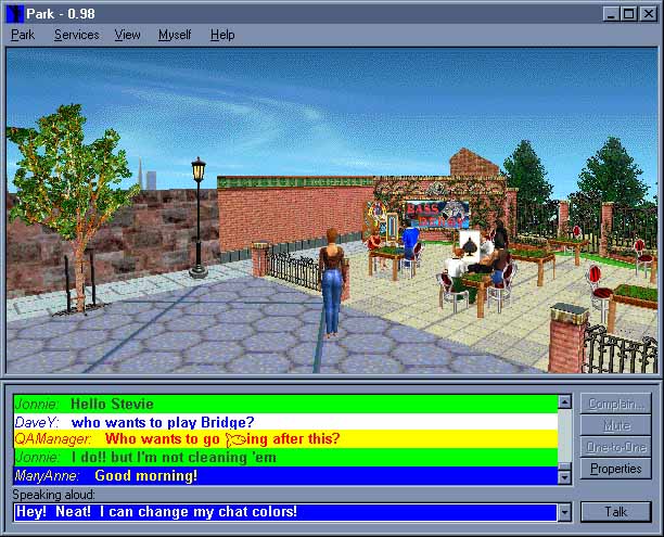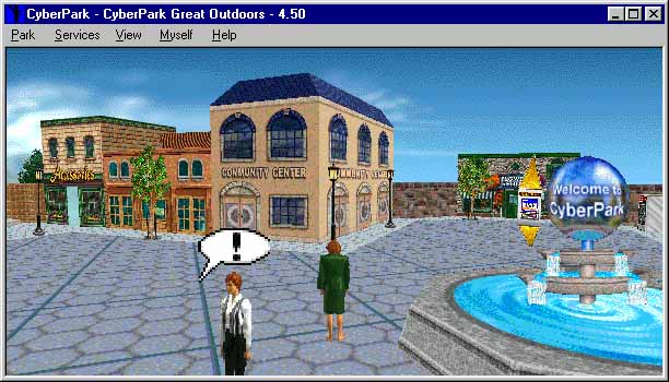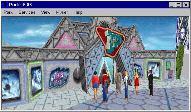 Another example of interactions that use the 3D presentation is that involved with the creation and display of the user persona or avatar itself. By allowing users to personalize their avatar, they are able to express an aspect of themselves or their fantasy selves to others through the 3D presentation. While in CyberPark the actual selection mechanism for body and clothing options are done in a 2D interface (through our "body builder" and "magic mirror" interfaces), the presentation uses the 3D paradigm to show off these selections. In addition, through the use of animation for selected actions, body language can be incorporated into the user’s selections, further utilizing the 3D presentation to fully express an avatar’s individuality. This is done in a primitive way in the current CyberPark implementation by having different walk sequences and chat sounds (embedded sound effects and phrases available in the chat interface) for male and female avatars. For future releases, the mood of an avatar (implemented today only as a user settable value) will also affect the animation, facial expression, and interaction with non-player inhabitants (NPIs) that roam CyberPark.