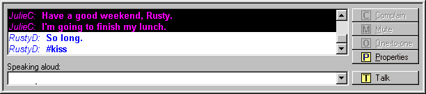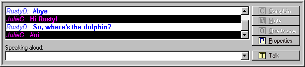 Another potential problem is too much scene complexity. When using a 3D world to promote social interaction, it must be simple for the user to identify and interact with the various other users and environment objects present. This means exploring ways to "unload" a scene of elements that are not required in the 3D context. For example, text chat is inherently a 2D interface. The 3D paradigm does not change the fact that you need to see all the text in order to read a message. Plus, the message needs to stay present and static within the scene long enough to read it. So, why clutter the 3D scene with the 2D text when there are really good 2D methods for displaying text? This is the approach taken in the design of CyberPark, where as many as 100 other avatars at the same time can be present in a scene. A voice bubble appears for 1 second over the head of the player who speaks a phrase in the 3D view ("!", "!!!", and "?" for talking, shouting, and questions). Meanwhile a scrollable chat window is displayed below the 3D view. This permits users to read text at their leisure while keeping the 3D display view clear for more dynamic scene elements. Likewise, the names of players and objects are not displayed in the 3D view unless the user either right-clicks on the player or object, or leaves the mouse hanging over the player or object for 2 seconds (i.e. using a tool-tip interface). The goal here is to keep 2D or textual data off the 3D display except for selected short-term information.